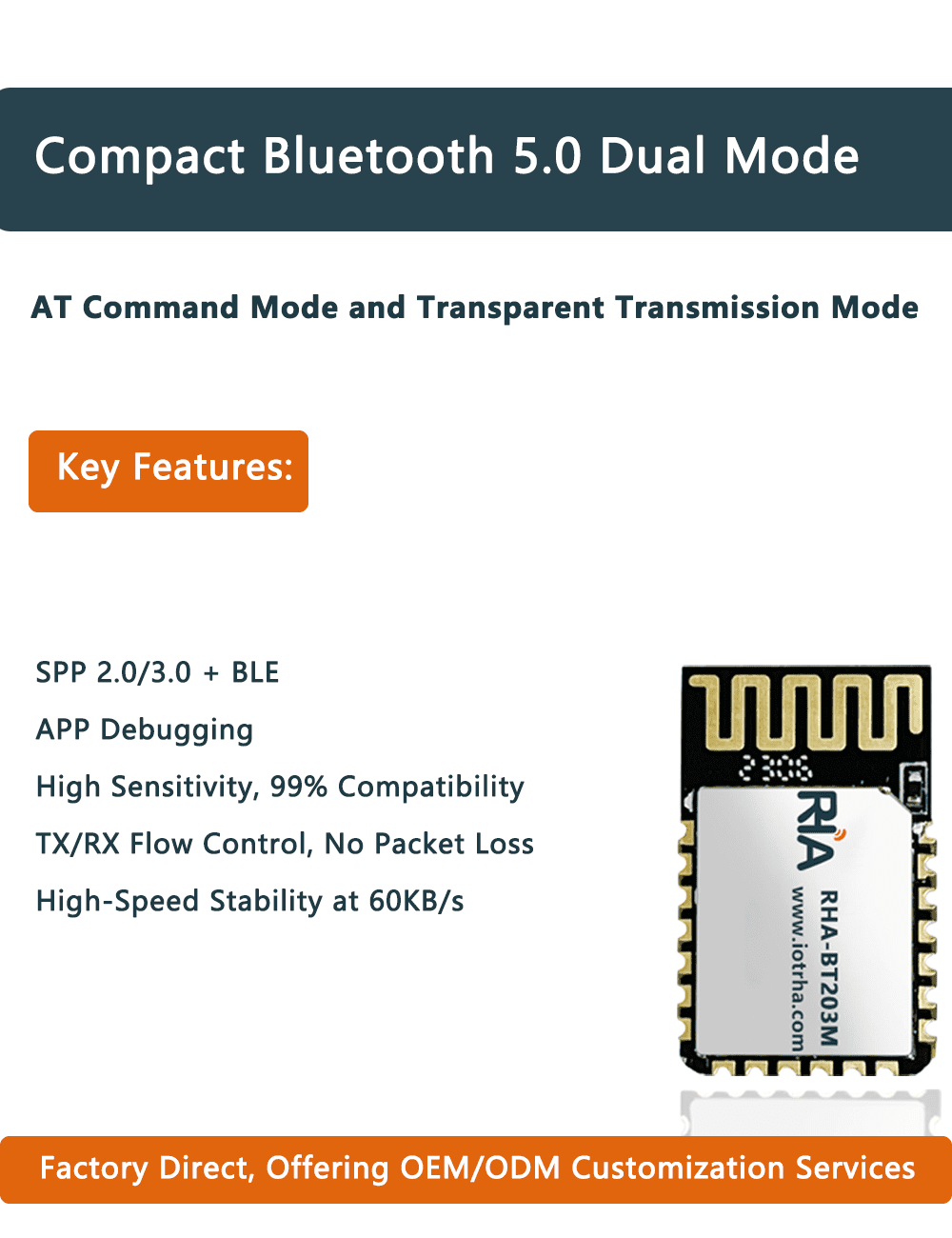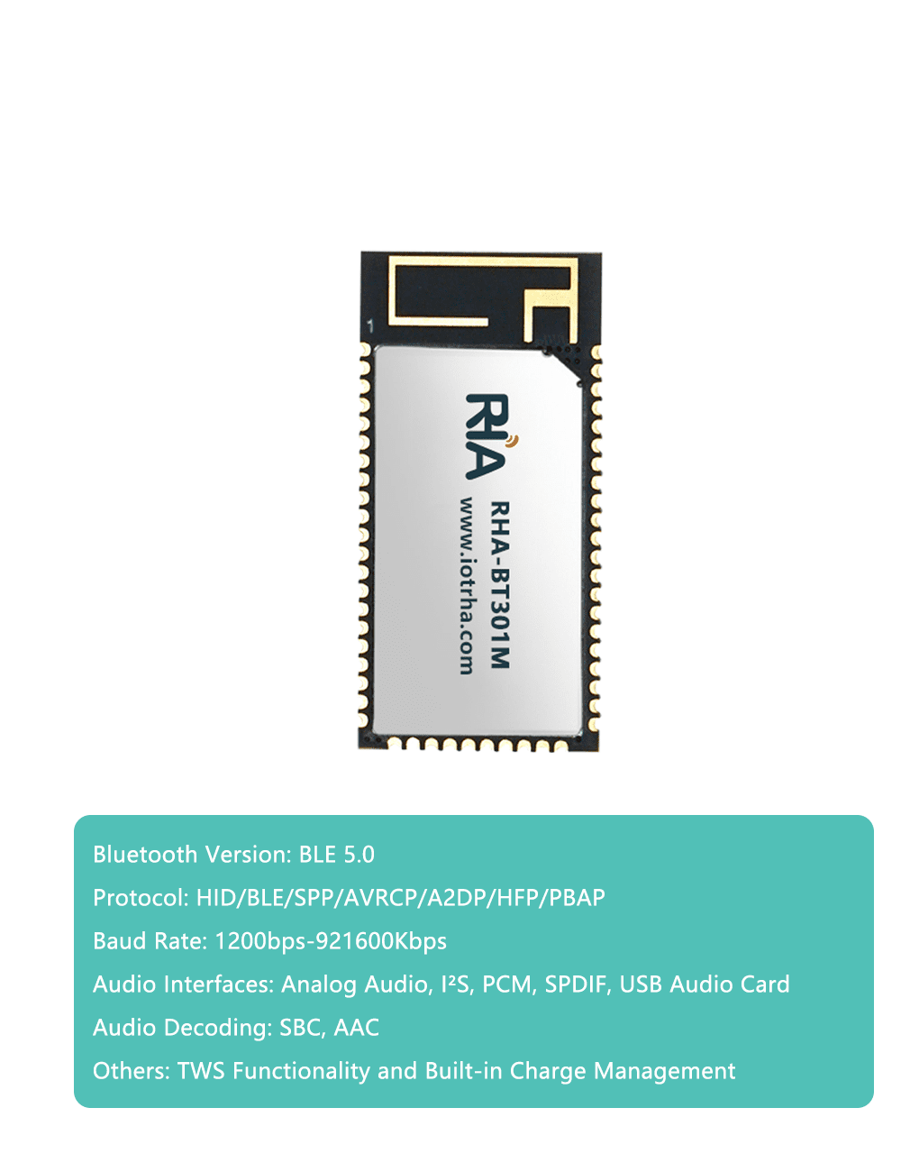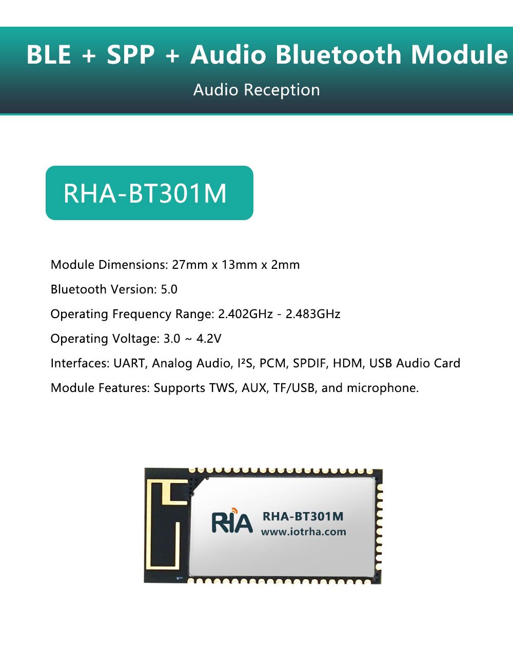 The RHA-BT301M is a versatile and high-performance Bluetooth 5.0 dual-mode module from IOTRHA, offering both audio and data transmission capabilities. This module integrates BLE, SPP, and audio functions, supporting low-latency audio streaming and TWS (True Wireless Stereo). With comprehensive protocol support including BLE, SPP, AVRCP, and I2S, it is ideal for applications ranging from smart home devices to portable audio systems. Its easy configuration via UART and AT commands allows for flexible integration into various projects, providing high-quality audio experiences.