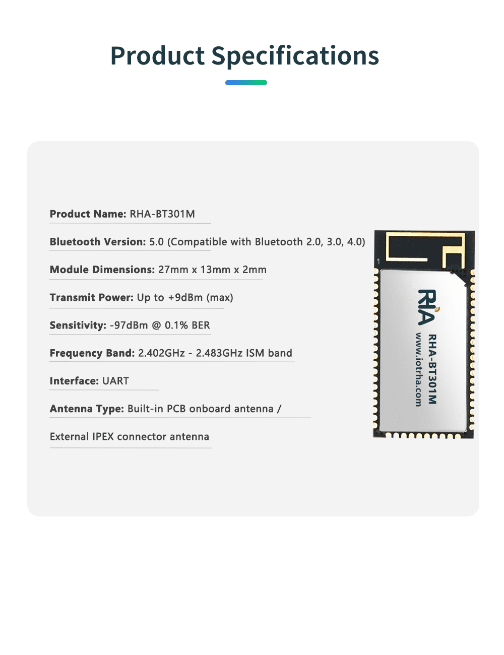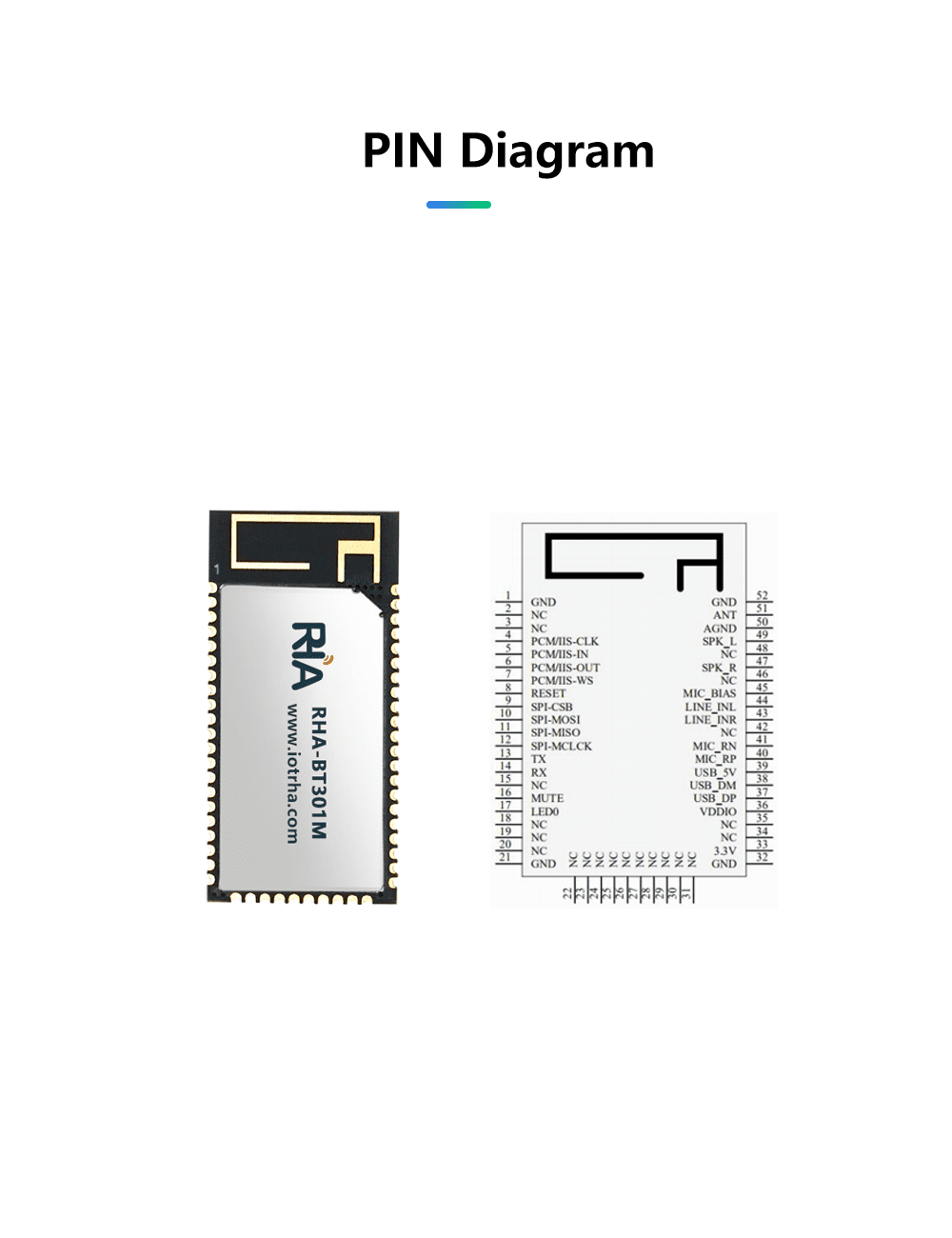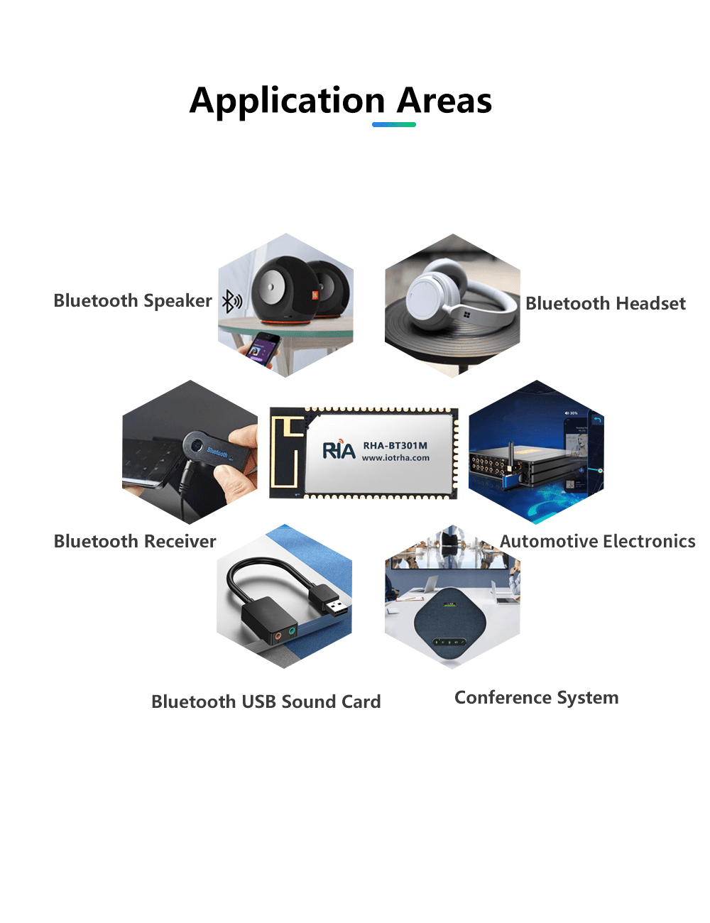 The RHA-BT301M is a versatile and high-performance Bluetooth 5.0 dual-mode module from IOTRHA, offering both audio and data transmission capabilities. This module integrates BLE, SPP, and audio functions, supporting low-latency audio streaming and TWS (True Wireless Stereo). With comprehensive protocol support including BLE, SPP, AVRCP, and I2S, it is ideal for applications ranging from smart home devices to portable audio systems. Its easy configuration via UART and AT commands allows for flexible integration into various projects, providing high-quality audio experiences.