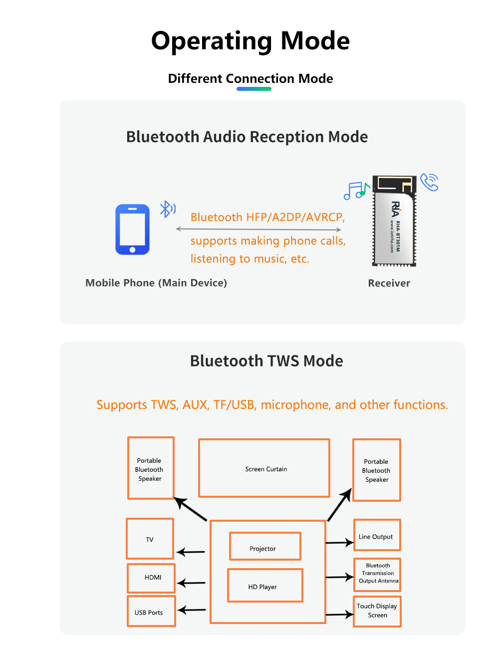 Bluetooth Audio Receiver Mode: Use with HFP/A2DP/AVRCP profiles to make calls or listen to music, perfect for automotive central control systems and home audio devices.