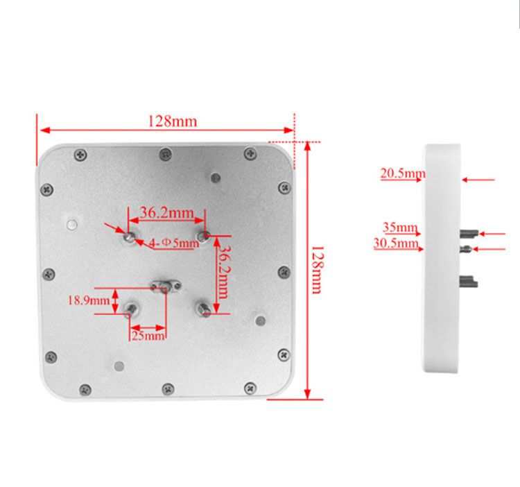 The 5dBi Circularly Polarized Antenna (128) is a general-purpose far-field antenna suitable for UHF band RFID applications. It features a compact size, high gain, low VSWR, good symmetry of the radiation pattern, and low axial ratio. It can be conveniently used in UHF RFID applications such as access control, warehousing, logistics, and retail.