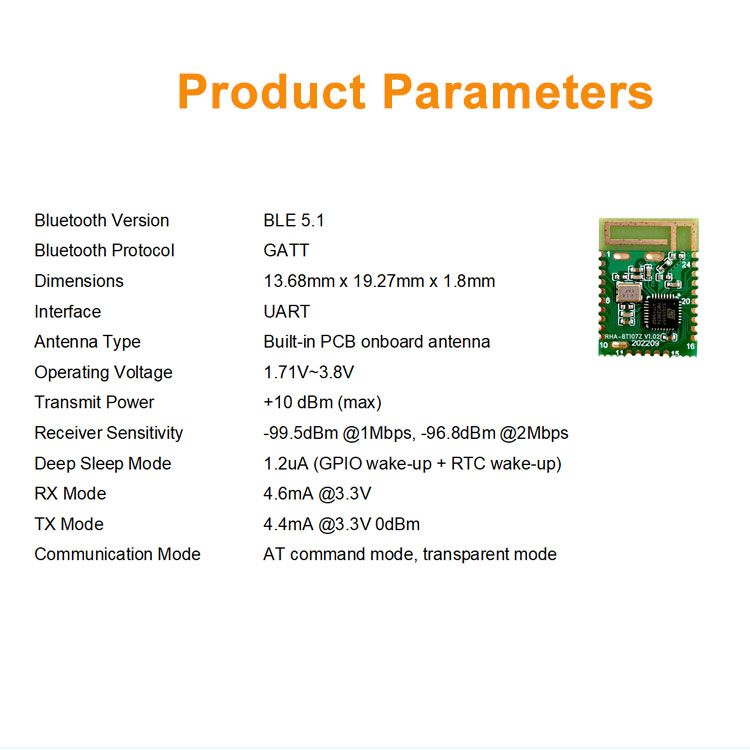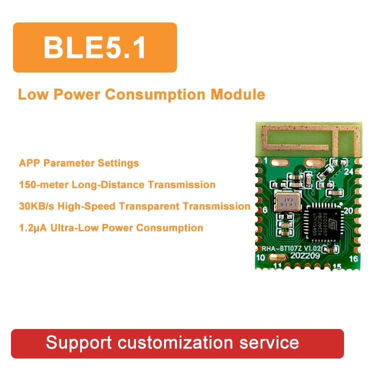 RHA-BT107Z is a BLE 5.1 module independently developed by IoTRHA. It features a small size, ultra-low power consumption, supports both master and slave modes, multiple connections, and a data transfer rate of up to 60KB/s. It is customizable and can be applied in smart home, health and medical, automotive electronics, and other fields.